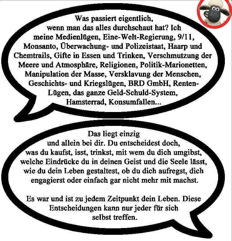 Es ist das, was wir die Matrix nennen. Die einigermaßen Aufgewachten sehen klar, aber bei den Schläfern hapert es noch gewaltig. Gestern wies Anut Pi wiederholt darauf hin, endlich den Corona-Schwachsinn zu beenden, jeder für sich. Jeder steht hier für sich alleine in der Verantwortung. Reißt die Masken endlich runter und führt wieder euer ganz normales Leben. Geschäfts- und Firmeninhaber. Macht eure Firmen wieder auf, jetzt, sofort. Sonst gibts ein bitteres Erwachen oder auch kein Erwachen. BEWEIST, DASS IHR NOCH LEBT!
