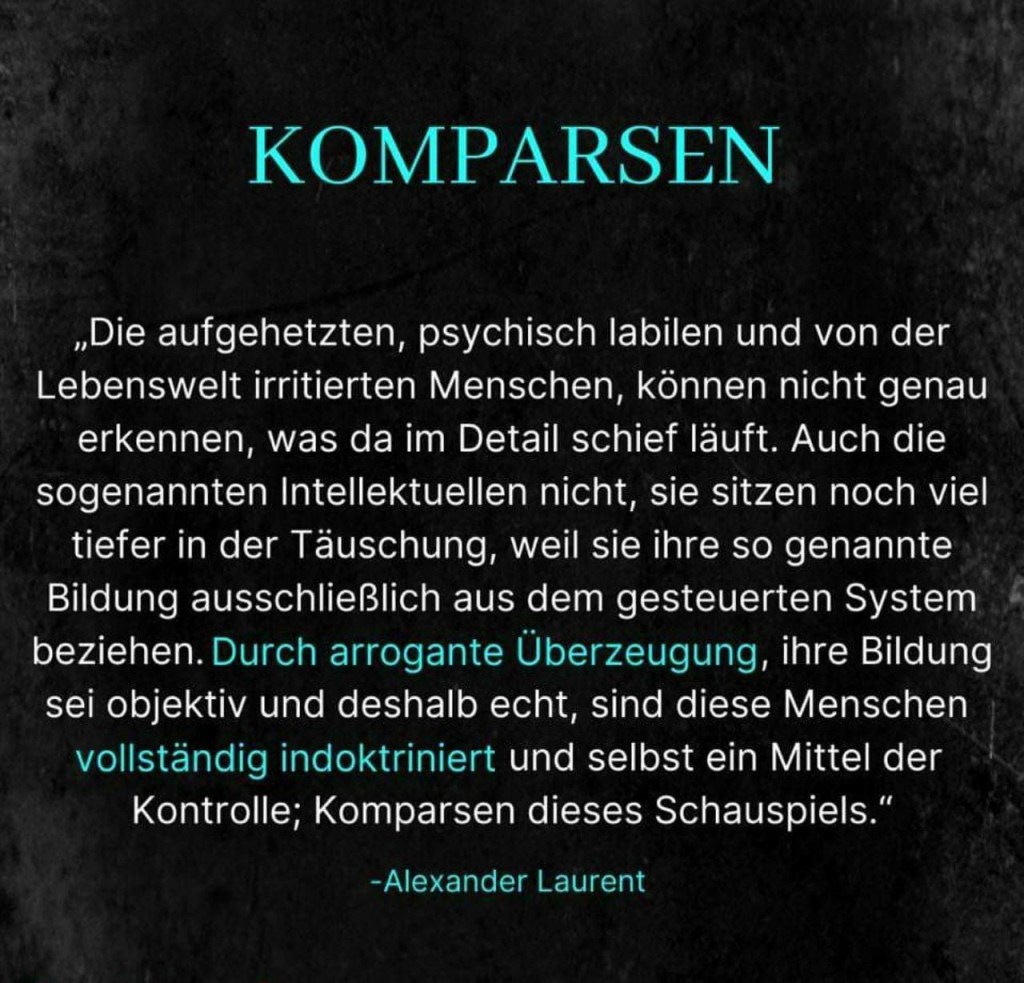 Sie sind leichte Beute für Rattenfänger aller Art und stecken voll im System, weil sie ja ZIELE haben – und diese Ziele sind alle noch verortet im alten, zusammenbrechenden System. Paradox ist, dass so gerade die besten, die intelligentesten, zielstrebigsten und eigentlich pflegeleichten Kinder solche Gehorsamssymptome zeigen. Sie sind seelisch verunsichert, fühlen sich dadurch im feindlichen System heimisch und verteidigen es durch ihr bereitwilliges Mitmachen. Maske, testen, unbedingt auch impfen – ist doch alles lebenswichtig und easy. Sie sehen sich selber als mutig an, sind aber nur noch dumm. Sie wurden absichtlich und systematisch verdummt.