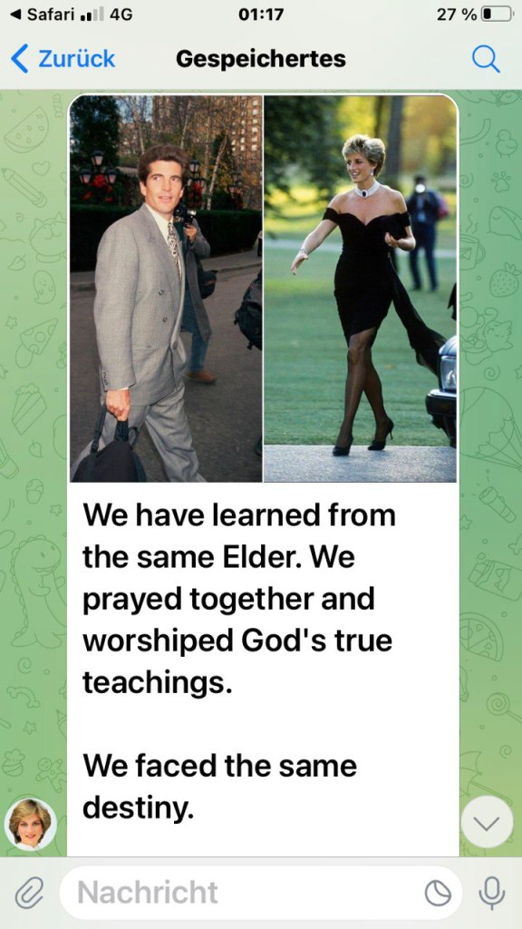 Prinzessin der Herzen z.B. ist immer noch lebendig und hat sogar einen eigenen Kanal bei Telegram, wo sie immer mal was reinsetzt, auch Fotos. Die sieht immer noch sehr schön aus. Eine Heilige ist sie schon, galt lange als tot und lebt doch – sehr geeignet, die Menschheit quasi als Hohepriesterin der neuen Schöpfung ins Licht zu führen. Mit all den andere ´Wiederauferstandenen´.