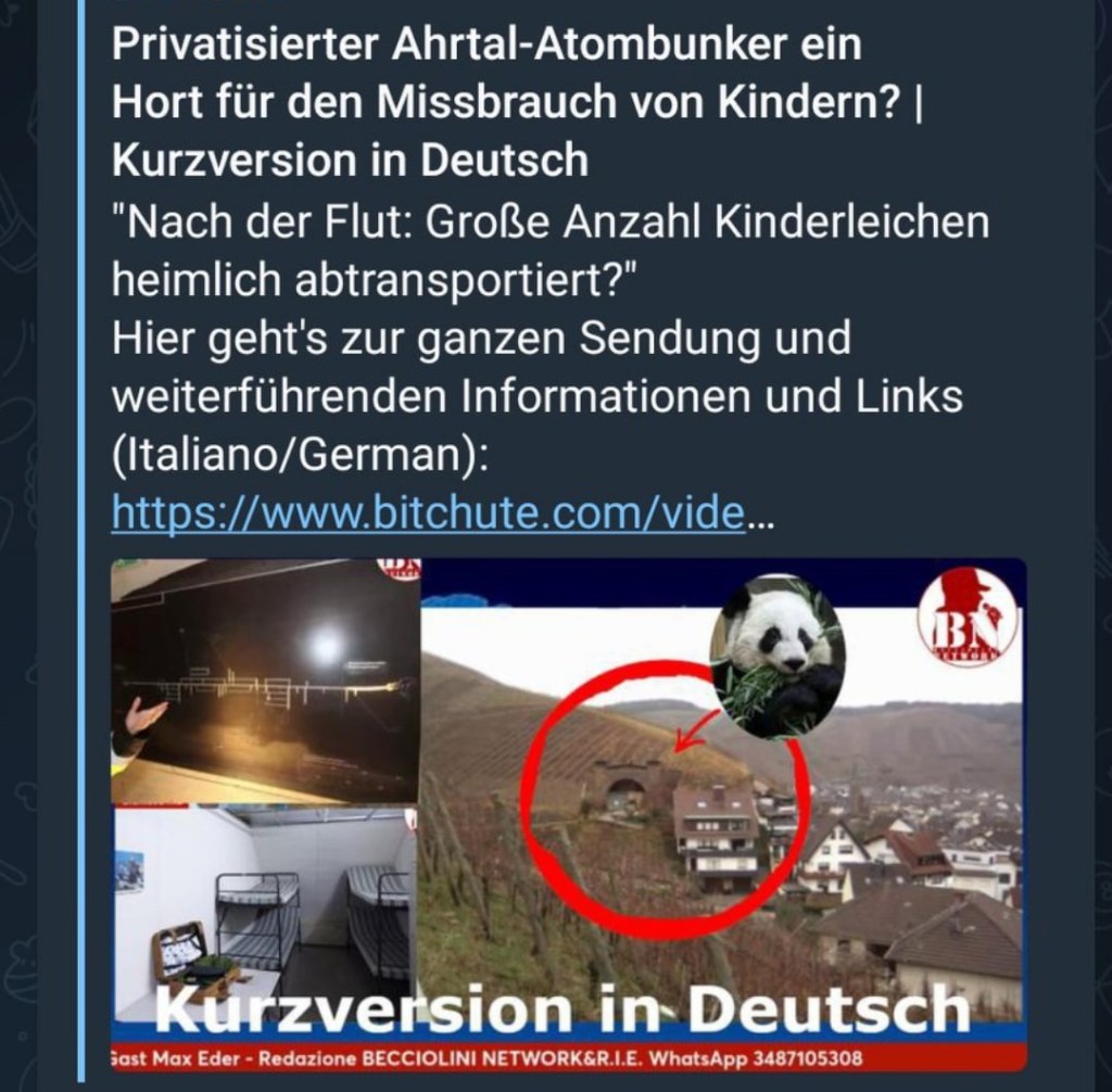 UJ: Aber das Ausmaß, was dann so mit Q erzählt wurde, das war mir zu weit. Aber ich habe ja durch meine eigene erzwungene Recherche auf meine Art so ein Ausmaß kennengelernt. Es geht mir jetzt nicht ums Detail, aber kann nur sagen: Keiner kennt die Dunkelziffern und deswegen halte ich dann solche Gerüchte wie über die 600 Kinderleichen im Ahrtal für sehr plausibel. Auch wenn sich da viele Augen und Ohren zuhalten und sagen nein, das ist verrückt. Da gab es doch diesen Spielplatz blabla und das wird aufgeklärt…